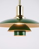 PH 3/2 Pendelleuchte, entworfen von Poul Henningsen und 1996 als Jubiläumsausgabe von Louis Poulsen herausgegeben. Die Leuchte ist aus Messing mit grünen Metallschirmen gefertigt, was dem Modell ein markantes und klassisches Erscheinungsbild verleiht. PH 3/2 gehört zu Poul Henningsens bekannten Dreischirmleuchten, entwickelt für blendfreies und angenehmes Licht. Die Jubiläumsausgabe wurde nur für einen begrenzten Zeitraum produziert und war auch in einer Variante mit roten Metallschirmen erhältlich.