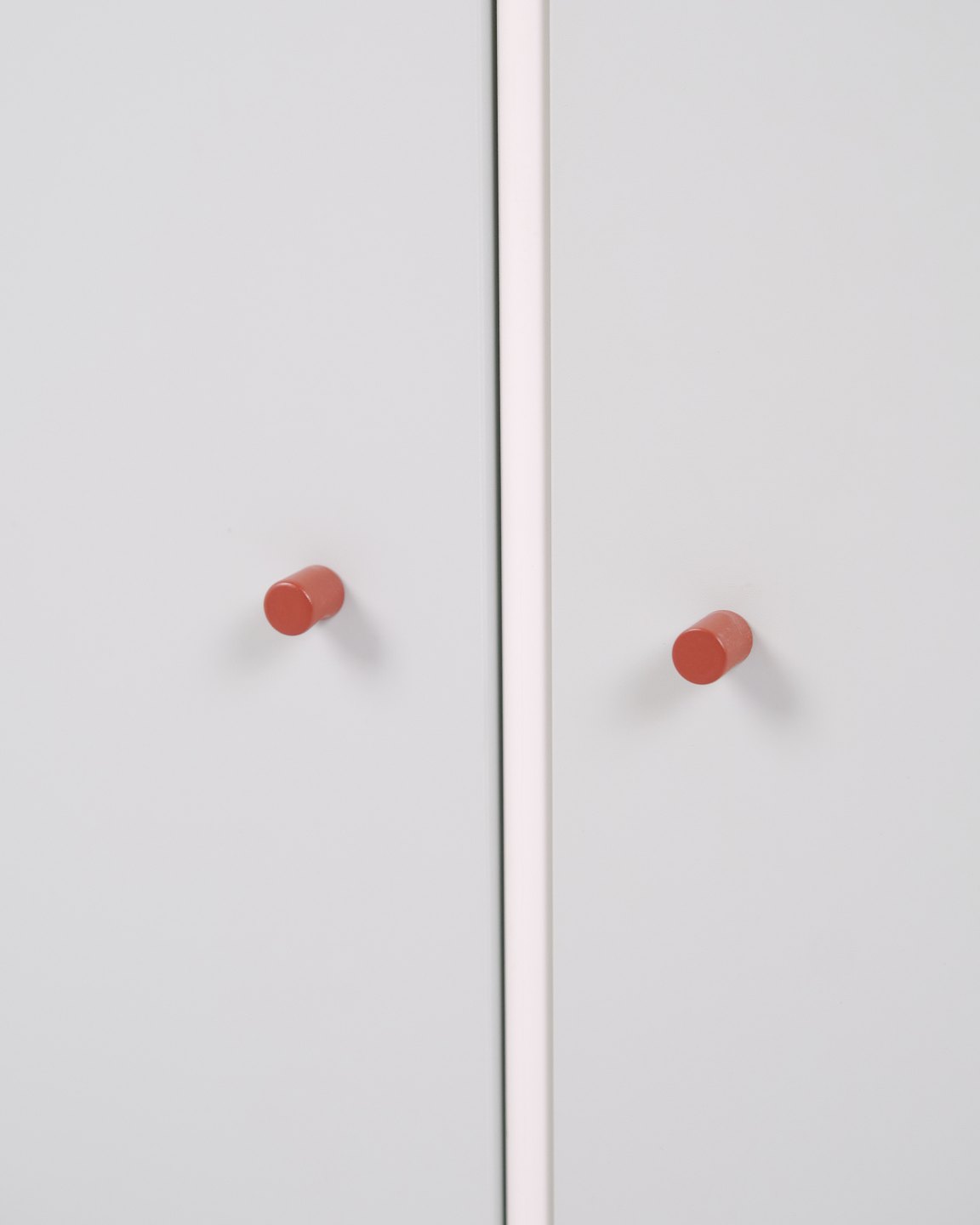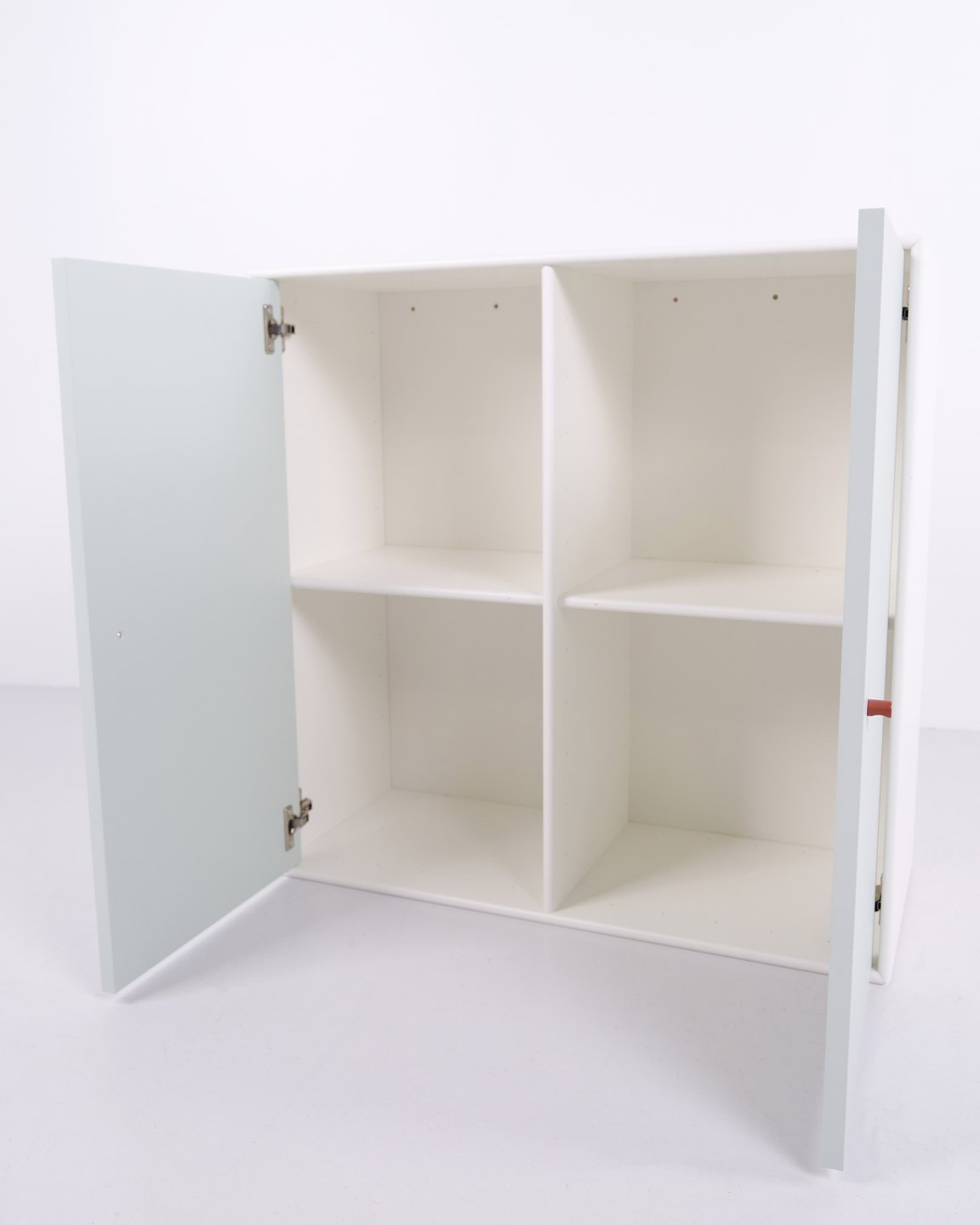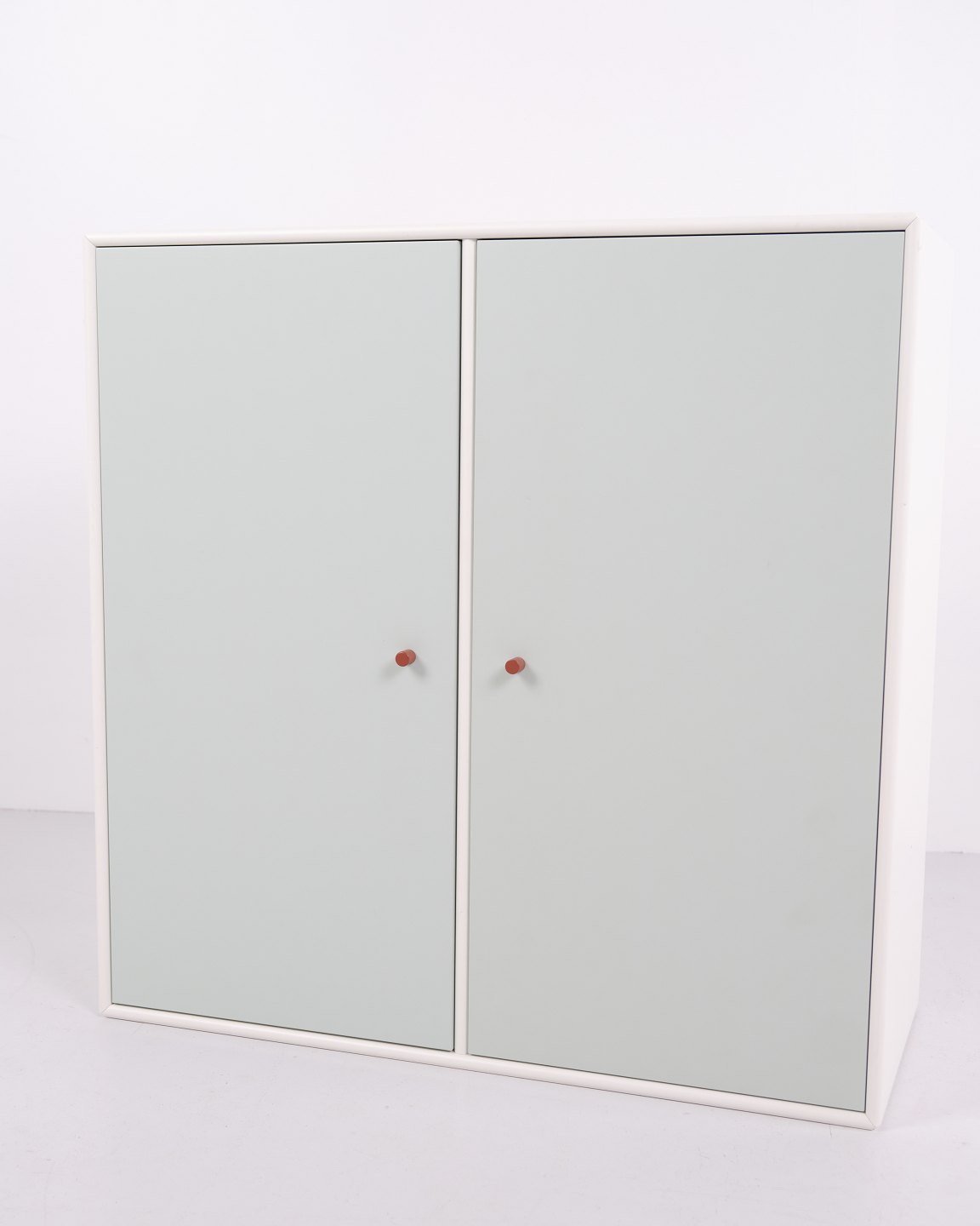 Montana Schrankmodul aus dem Montana System, entworfen von Peter J. Lassen für Montana. Aus lackiertem MDF mit weißem Korpus, zwei mintgrünen Türen und braunen Griffen. Geeignet als Wandschrank, Flurmöbel oder Aufbewahrungsmodul. 2 Stück auf Lager.