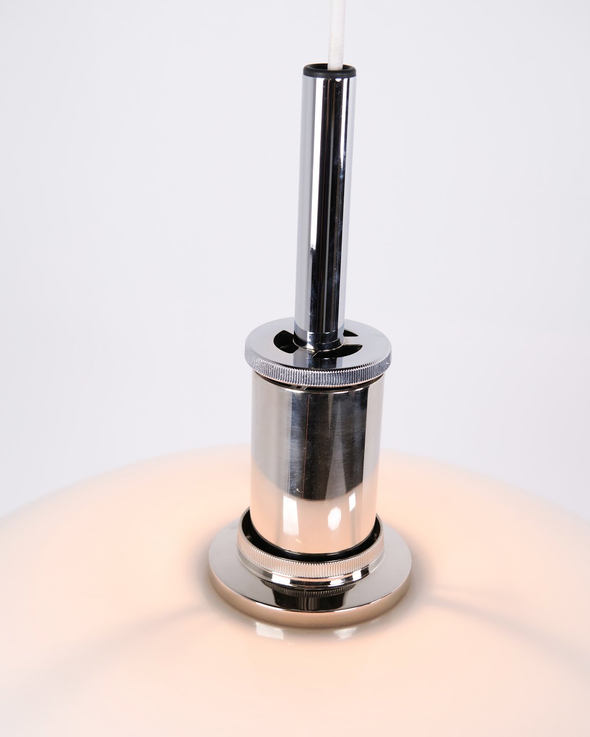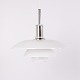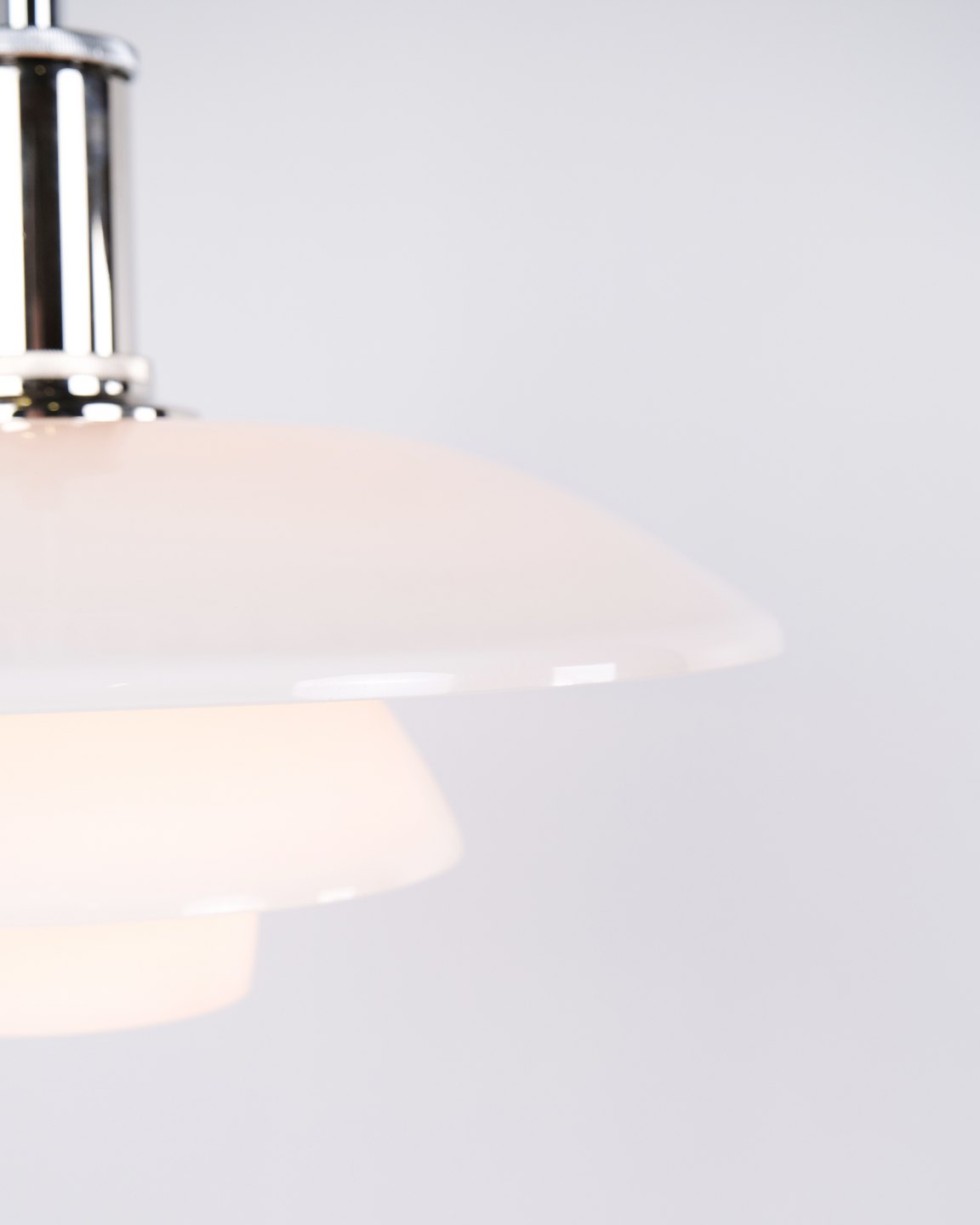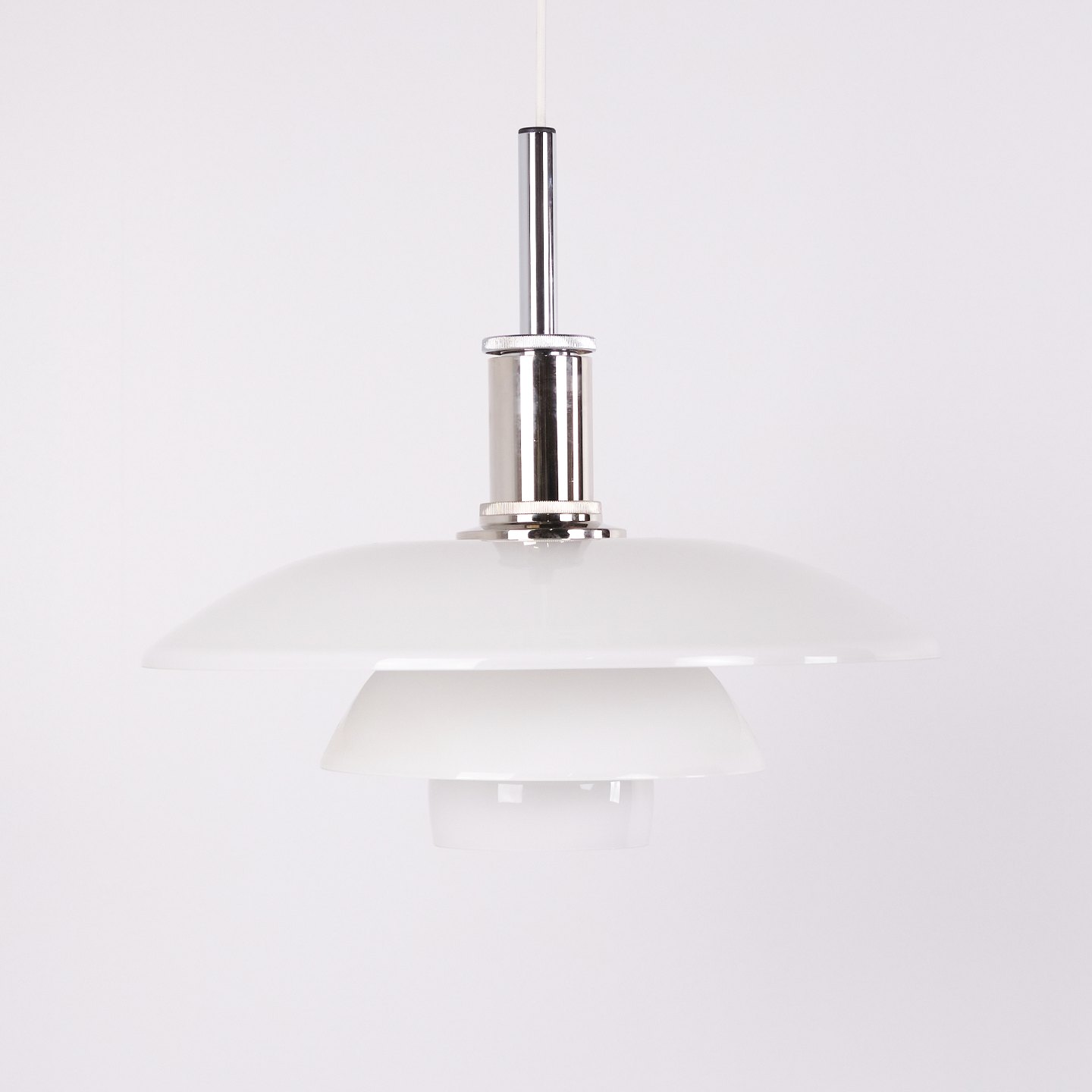 PH 4½-4 Pendelleuchte, entworfen von Poul Henningsen für Louis Poulsen. Die Leuchte ist mit mundgeblasenen Dreischirmen aus weißem Opalglas und Chromaufhängung gefertigt. Das Modell besitzt einen oberen Schirm von ca. 45 cm und verwendet die unteren Schirme der PH 4/4 Serie, entwickelt für eine breitere Lichtverteilung bei niedriger Aufhängung über Esstisch oder Tischfläche. Die heutige Version wurde 1980 eingeführt und ist Teil des ikonischen blendfreien PH Beleuchtungssystems.